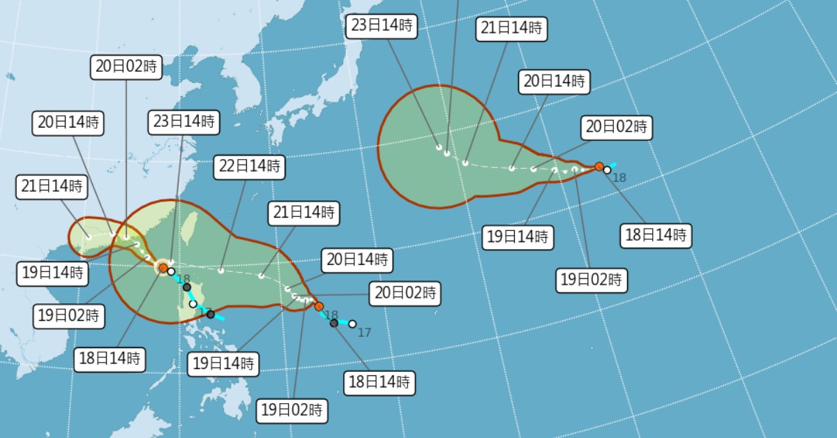 要留意的是,菲律賓東方的熱帶系統,預報朝台灣方向前進中。氣象專家直言,會經過環境垂直風切小的海域,加上海面溫度溫暖。各國預報模式都認為,它發展的強度,至少可達到中颱至強颱等級。如果移動方向,移動速度及強度變化不變,預計9/21晚間發布海警,9/22發陸警,9/23到9/24,最靠近臺灣陸地。