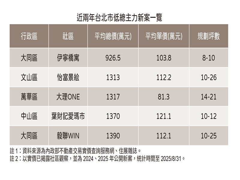 而羊毛出在羊身上,首都新案還能買在低總,代表的恐怕是單價面的反向走高,這些低總案中,只有去年推出的「大理ONE」可以低於每坪百萬元水位購得,其餘皆為百萬宅,更不難想像坪數上的限制,總價最低的「伊寧橋寓」坪數規劃最大才10坪,而「葉財記愛瑪市」最大12坪,其他案至大也是20多坪,且5案當中還有公設比來到4成者,空間使用上買方得有強大心理素質。