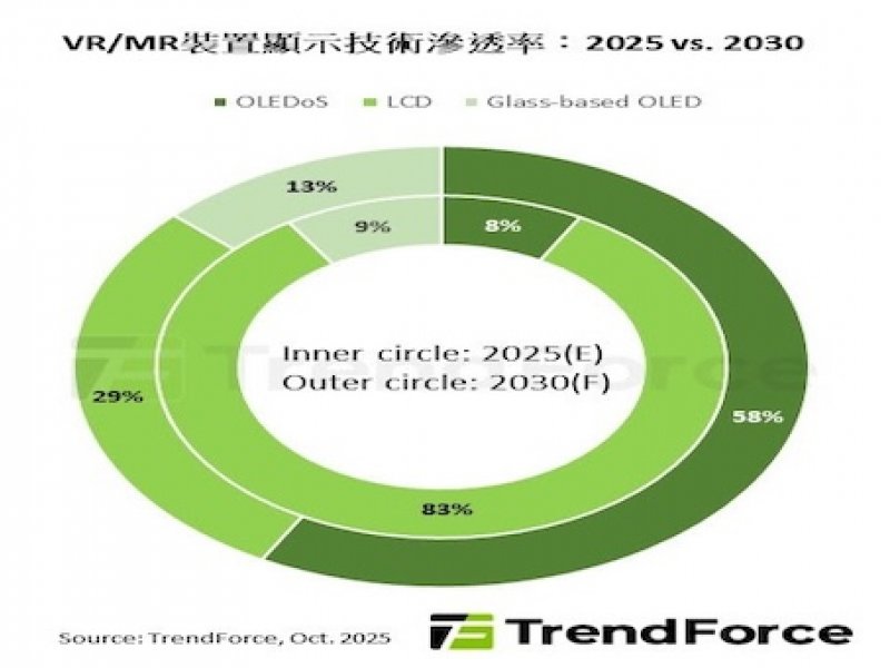 另一大廠Meta在強化自家生態系的同時,計劃採用0.9吋OLEDoS搭配Pancake光學架構的組合,以突破現有產品形態限制,滿足VR/MR的輕薄化需求。TrendForce預期,在成本與技術雙重優化下,OLEDoS有望從中高階市場逐步向主流市場滲透,成為推動VR/MR產業轉型升級的重要驅動力。