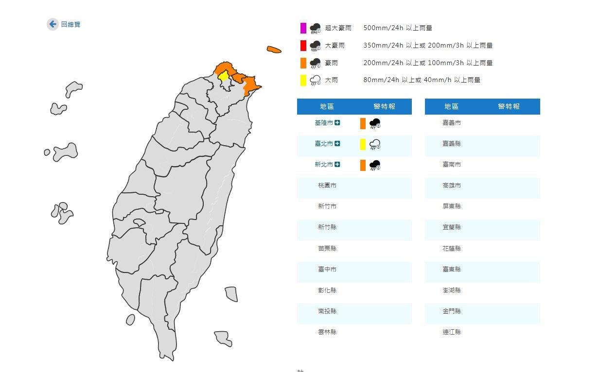 中央氣象署發布豪雨特報、大雨特報。(圖/中央氣象署)