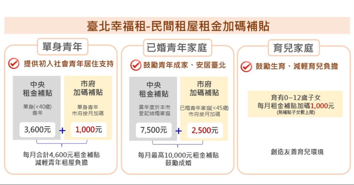 為協助青年與婚育家庭在臺北安心扎根,臺北市政府都市發展局推出「臺北幸福租-民間租屋租金加碼補貼」,在中央「300億元擴大租金補貼專案」基礎上再加碼補助。115年度新制已於4月8日正式上路,除了中央補助外,針對單身青年、已婚青年家庭及育兒家庭,北市府另外加碼補助,提供更完善的租屋支持。