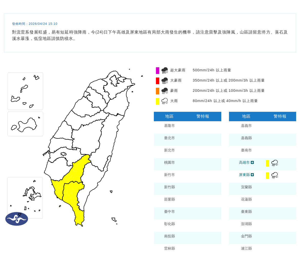 受對流雲系發展旺盛影響,今(24)日有局部大雨或豪雨,中央氣象署於15時10分左右針對2縣市發布大雨特報,提醒民眾注意瞬間大雨,山區慎防坍方及落石、土石流及溪水暴漲,低窪地區請慎防積水。
